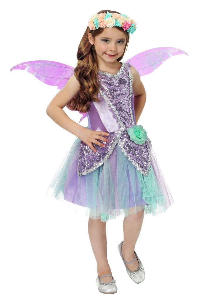 This purple, shiny dress has sequined petals laying over the tulle skirt and matching sequins on the bodice. She’ll also be set up with her very own iridescent fairy wings that attach with clear elastic bands to keep flitting around easy. The look is topped off with a pretty flower crown so that your little one will feel more magical than ever! You always had an inkling but now you’re sure. There are fairies in your very own back yard!
