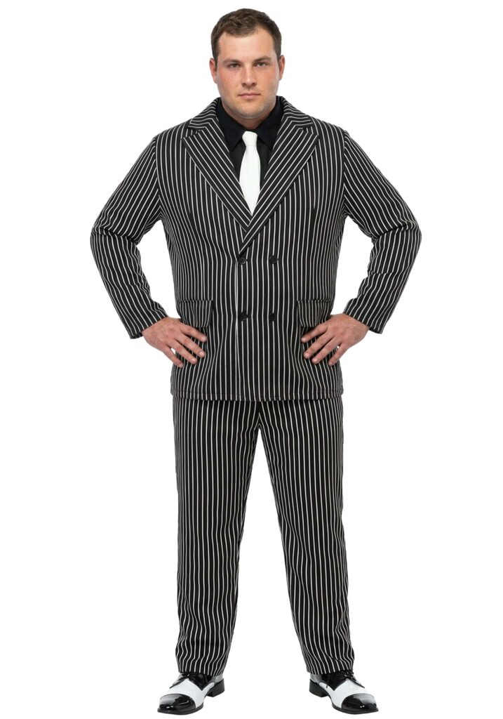 Back in Al Capone’s days, it took a lot more than running a successful bootlegging empire to become a legendary mob boss. You had to stand out from the competition, act like a gentleman (at least in public), turn heads when you walked in the room (courtrooms especially), and know how to make a memorable first impression. In other words, you had to have style. Guys like Al Capone and Bugsy Siegel understood that, and it’s probably why you didn’t even have to look them up on Wikipedia when we mentioned them. They’re practically immortal.While we can’t exactly recommend them as role models, you can still take a page from their fashion playbook and become a made man with the wide stripe plus size gangster costume. Whether you want to be the don at the next meeting of the Five Families or just the Halloween party (option B would probably be safer), there’ll be no mistaking you for the boss of bosses in this slick 1920s-style suit. Made by us, it’s a classic two-piece with matching pants and jacket (double-breasted, the preferred cut of a true wiseguy), and a fearsome combination of white pinstripes on black cloth. The pants also feature an elastic waist that makes this getup easy to get on, because mobsters are used to getting what they want right away.If you’re an aspiring don, the gangster costume is a suit you can’t refuse. Just don’t forget to wear a ring so your associates have something to kiss when they call you “godfather”!