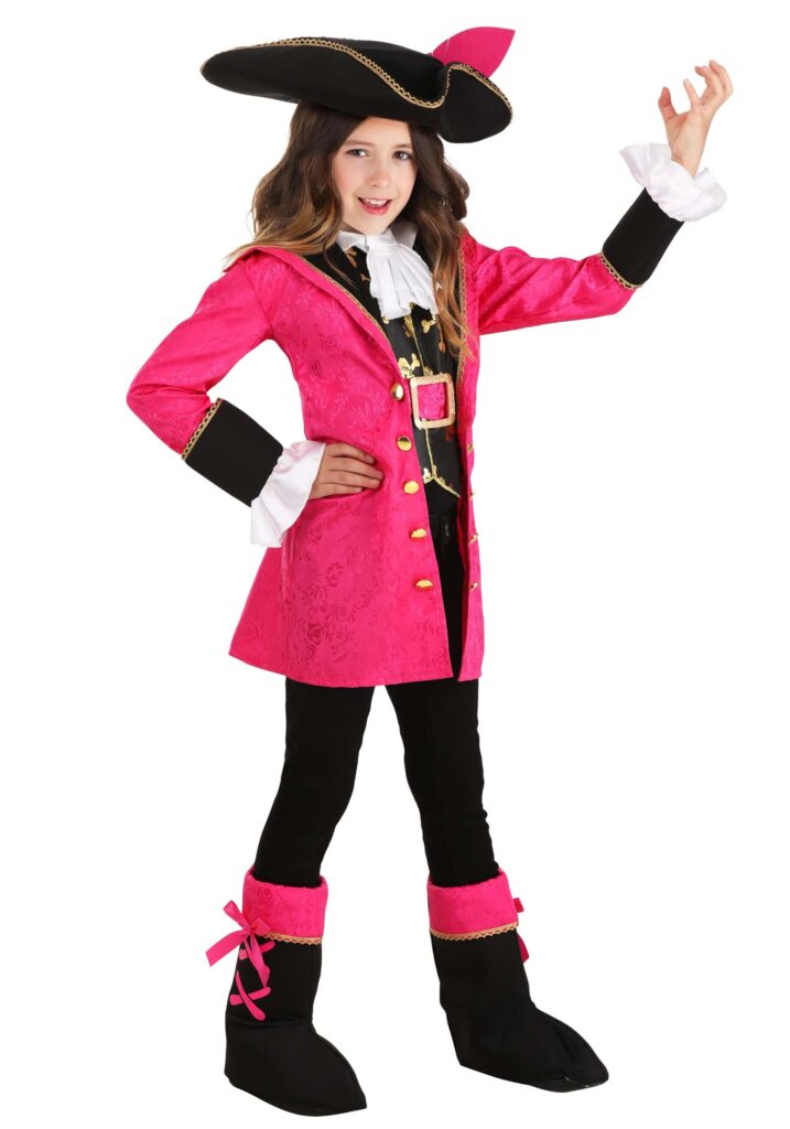Shiver me timbers! This may be the most incredible pirate costume we’ve ever seen. Made exclusively by our in-house designers, this look comprises incredible details fit for only the most feared and revered pirates. It includes the stunning deep pink brocade jacket complete with gold buttons, dramatic cuffs, and an attached belt. The boot covers bring in the same deep pink hue and make your kid’s footwear appear instantly seaworthy. The shirt is a black background printed with golden pirate skulls, as well as a frilly white collar. Add the tricorn hat , a pirate staple , and your little scallywag is ready for the high seas…or at least an amazing night of trick or treating!