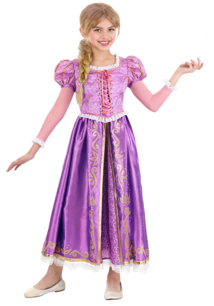 With an imagination just like Disney’s Rapunzel’s, all your kiddo needs to follow her dreams is our officially licensed Disney Rapunzel costume! This exclusive costume will have your little dreamer feeling like the beloved Disney Princess in one easy-to-wear but elaborate piece. Rose and purple shades of taffeta compose the bodice, puff sleeves, and skirt of the costume ensuring this look is inspired by Rapunzel’s dress from the start.What’s more, additional thoughtful details make this Made By Us garment a dream come true! Gold lame trims the puff sleeves and skirt hem as well as the princess seams featured on the bodice. A combination of ruffles, white lace, and gold lace embellish the costume dress further. Meanwhile, intricate embroidery decorates the bodice giving it the same whimsical feel as Disney’s Tangled.