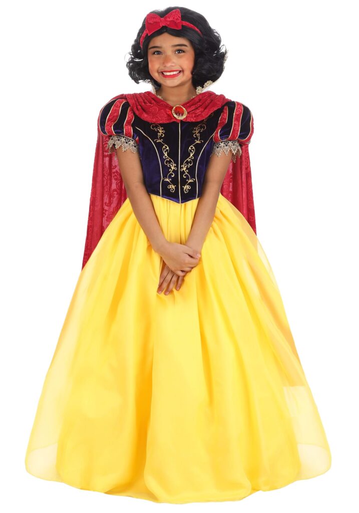 Help your kiddo connect with the first Disney Princess when you give her this Kid’s Premium Disney Snow White costume! This colorful costume has all the details your child will need to feel like she can be kind and courageous on her next adventure. The Made By Us costume begins by securing the velvet blue bodice, complete with golden trim.The sleeves are matching blue and red velvet and the skirt features bright yellow with a full-length fit. Golden trim shines and brings out the red of the classic bow and cape that has a red faux gem brooch at front neck. The only thing better would be gathering up a group of friends for a Disney Princess group costume!