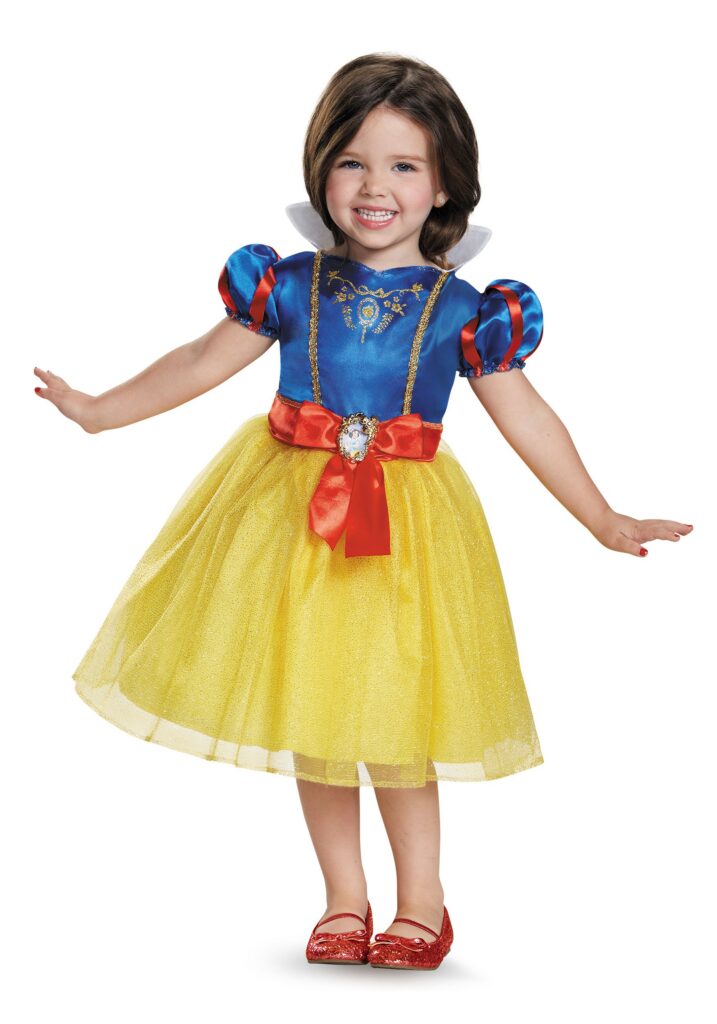 Product DetailsSo if your petite princess loves her dwarves and animal friends, then this Snow White Classic Toddler Costume will be the perfect thing for her to wear during her woodland-dwelling adventures! Modeled after Snow White’s iconic dress with a blue bodice, puffy red and blue striped sleeves, a yellow skirt, and a high white collar, there will be no mistaking who’s the fairest of them all when your little girl is wearing this costume! Add some yellow or red shoes and a red cape for a complete Disney Princess look. Heigh-ho, heigh-ho…off to imagination land she’ll go!