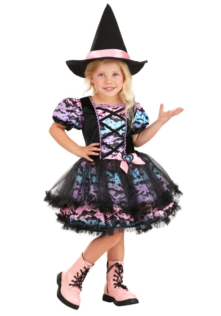 This little witch is going to look absolutely perfect whether she’s out trick-or-treating with her friends or flying past the full moon with her kitty familiar. Thanks to her outfit, she would be right at home attending a monster ball, a Halloween school assembly, or playing dress-up all year long. It’s not every day that you see a witch with such amazing fashion sense that she thought to combine the colors of a morning rainbow with the spookiness of her bat companions.