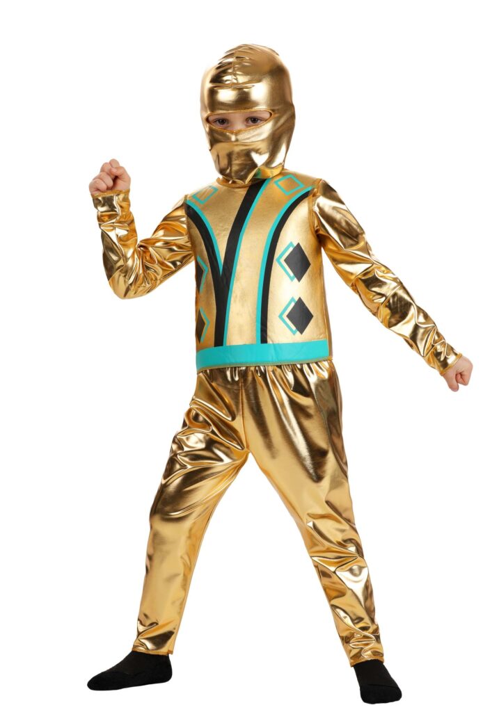 The costume includes a metallic gold shirt, matching pants, vest, and hood, all made from lightweight, shiny fabric for maximum wow-factor. The shirt features a bold green and black diamond pattern on the front, giving the look a splash of color and extra flair.The pants have an elastic waistband for comfort and easy movement, while the gold hood slips over the head with an opening for the eyes, keeping their identity “secret” while still being totally adorable. The separate vest adds another layer of detail, making the costume feel like authentic ninja battle gear.Ninjutsu Looks Good in Gold.