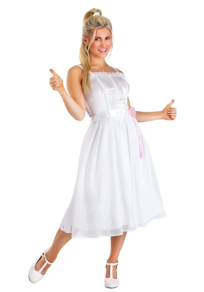 Design & DetailsThis costume features a white satin bodice and underskirt for that classic prom dress shine, paired with a flowy chiffon skirt overlay that twirls like a dream. The dress zips up through the waist for easy wear, and the boning inside the bodice adds structure to keep that perfect fit all night long. The included scrunchie ensures you can complete the iconic high ponytail look, just like Sandy’s famous ‘do.With delicate ruffle trim on the neckline and a waistline ribbon complete with floral detailing, every inch of this dress screams 1950s prom chic. From the satin waistband to the zip-up back, it’s a high-quality design that’s ready for the spotlight, officially licensed and made with care.A Night to RememberWhen you step into this outfit, you’re stepping into your favorite cinematic moments. Whether it’s Halloween, a retro-themed party, or even a Grease sing-along, you’ll be ready to rock ‘n’ roll all night long. The satin and chiffon combo feels elegant, while the lightweight design keeps you comfortable for all your moves on the dance floor!