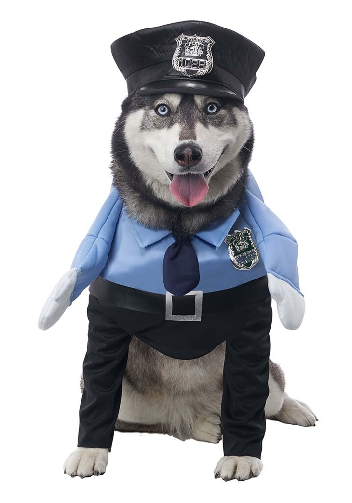 Give your vigilant pup a fun and hilarious outfit via this Security Guard Pet Costume! The soft fabric costume secures around your pet’s neck and features two “pant legs” that fit over your dog’s front limbs. The upper portion is made of blue fabric and is decorated with a faux shirt collar, an attached navy necktie, an appliqued “badge”, and soft, stuffed arms. The black bottom portion begins below a faux belt with a printed silver-tone buckle. The black police-style hat has a stretchy cord to secure it beneath your dog’s chin and is decorated with a silver-tone badge. K-9 Unit Ready Dress your dog in this funny costume and no one needs to know that he or she would allow any burglar entry in exchange for delicious dog treats! Check out our collection of police and security-themed costumes if you want to dress to match, or consider wearing a robber costume to prove how good your pup is at catching the “bad guys.”