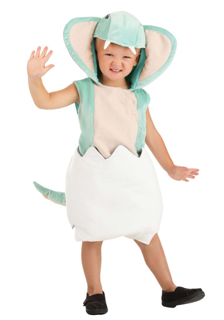 Your toddler will be hissing with delight when he or she wears this adorable Hatching Cobra Snake Costume for Toddlers! The exclusive costume includes a sleeveless romper made of green polyester velour with a beige inset and a diagonal front opening that makes getting dressed easy (in terms of dressing a toddler, anyway). Elastic in each pant cuff keeps the outfit in place and a stuffed tail is sewn to the romper’s seat. The attached hood has stiffened, beige-lined threat flaps sewn to each side. Embroidered eyes and soft-sculpted white serpent fangs make the costume look fierce yet fetching. The foam-backed shell accessory slides up the legs and fits over the romper’s bottom half like a pair of briefs, thanks to the slit in the back for the tail, and can be attached to the suit. Snake Phobia No More Are you afraid of snakes? You won’t be scared of this one! It’s too cute and funny to be anything but capture your heart. Your budding serpent enthusiast will be delighted to dress as one of his or her favorite animals!