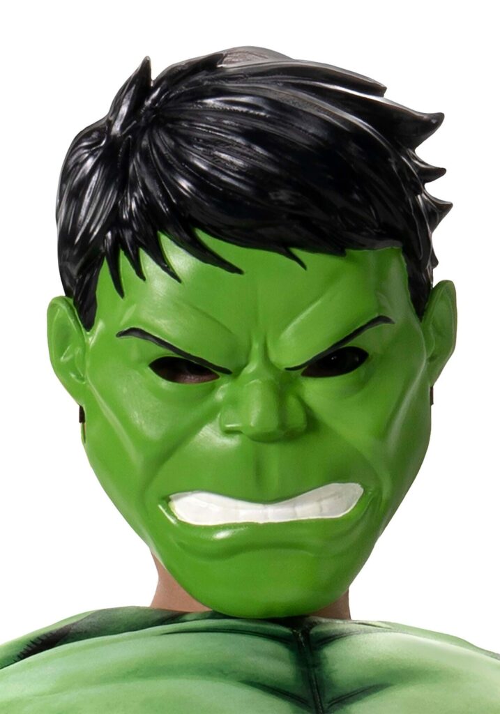 This officially licensed Kid’s Incredible Hulk Full-Face Mask really is an incredible addition to your costume! The molded plastic mask conceals your entire face and is detailed to look like a snarling Hulk. The top of the mask features molded hair, and the inside is lined with a foam forehead pad. It secures around the back of your head with an elastic band. Green Machine Your super skills are legendary and you’re definitely one of the mightiest Avengers! Congratulations on learning how to control your Hulk powers so that the green guy only comes out when you need him to, like when the universe is in danger or when you need an especially awesome Halloween costume.