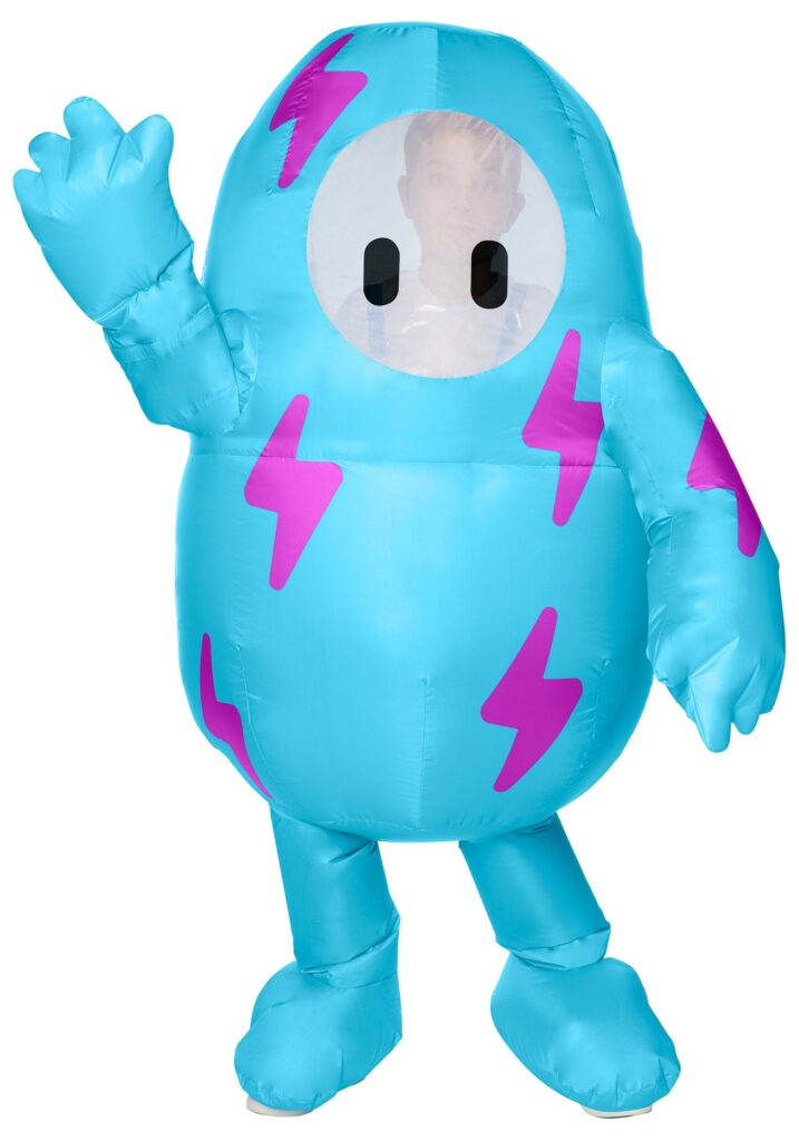 This officially licensed costume includes a full-body inflatable jumpsuit made from lightweight polyester windbreaker fabric. Once your child steps inside and zips it up, the built-in fan goes to work. Just switch it on, and the suit inflates in seconds to reveal the unmistakable bean-like shape. Keep the fan running to stay fully puffed and party-ready.The design is modeled after one of the classic skins from the game. The bright blue base features a scattering of bold pink lightning bolts for extra flair. The rounded limbs and oversized body match the look from the screen, and the face panel on the front lets your kid see clearly as they shuffle from house to house. Batteries for the fan are not included, but the laughs will come standard.The Wobble Has Entered the Chat.
