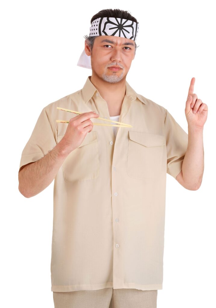 Design & DetailsShow the world that simple actions and appearances can hide true mastery when you wear this officially licensed Mr. Miyagi costume kit from The Karate Kid. If you’ve noticed a pattern, so far, it holds true here. Our in-house design team worked to create a movie replica look based on your favorite sensei. It includes a tank-style undershirt and a button-up overshirt. The lotus headband will ensure everyone knows who you are… though the included chopsticks will help you both enjoy a snack and play out your favorite scene!Fun is EasyAlright, maybe ‘strike hard, strike first, no mercy’ doesn’t actually make for a particularly complex setup, now that we think of it. There is something to be said about being cool-headed, not to mention comfortable, whether you’re taking down the Cobra Kai or just enjoying some dinner with your Daniel-san!