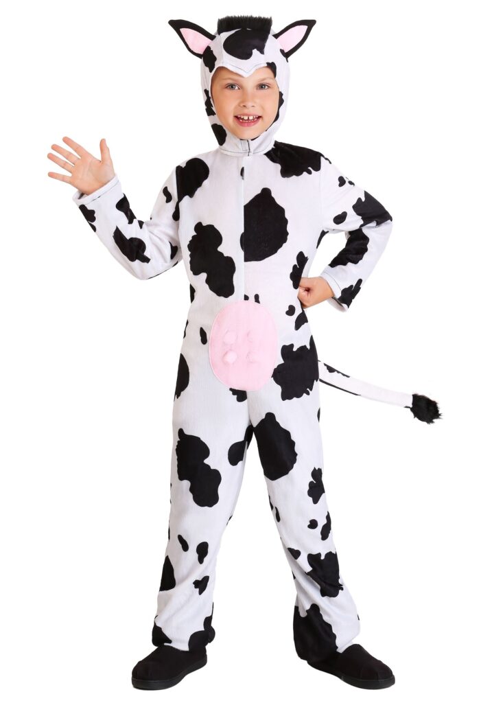 Design & DetailsOur costume designers worked hard on crafting an outfit that captures the cool cow vibe. They studied those bovine fellows and got inspiration from their wonderful spotted patterning! Then, they got to work on this child’s Cow Costume! It’s an exclusive design that comes with a soft jumpsuit that has the black and white cow pattern on the exterior. It fits quite easily with a zipper along the front. It has a faux fur tail attached to the back and a soft udder in the front. Finally, the hood helps give your little one the true vibe of a cow, since it has a pair of plush ears on the sides! It fits with a fastener under the chin. Combine that all with your child’s cool attitude and your little one will be ready to hit the fields!Barnyard BuddyIf you have one cool kid looking to be a barnyard buddy, then this exclusive cow costume is perfect for your child! Check out all of our farm costumes to make barnyard themed group costume and the whole family can join in on the farming fun.