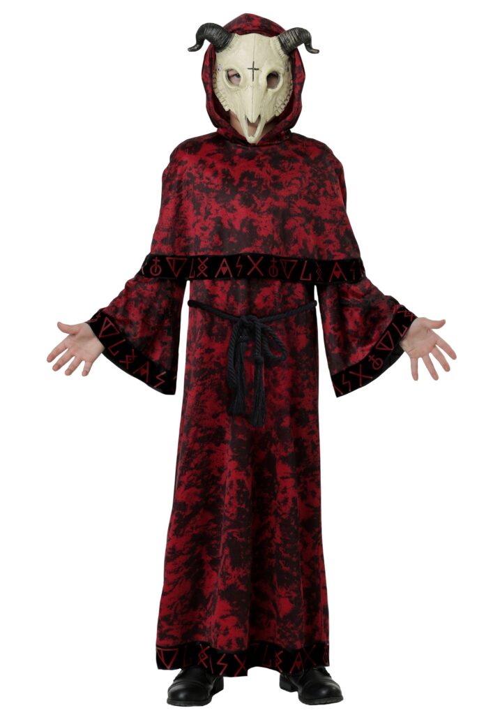 Our costume studio kind of outdid themselves with this outfit. We asked for scary, truly terrifying, and we have to say, this exclusive look totally delivers! This is one bone-chilling costume! The robe is a pattern of blood-red and night-black, with printed rune-like symbols along the hemline and included belt. Bell sleeves add to the drama, especially when paired over black gloves (not included, but highly recommended). The robe’s hood fits atop the goat-skull mask, completely concealing your child’s face and replacing it with something utterly frightening. Add a trident or another spooky weapon for a look that’s the complete opposite of your cheerful child. Fun! Scaring is Caring.