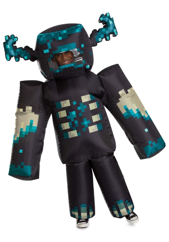 This officially licensed costume is made of lightweight polyester windbreaker fabric that creates a secure seal when inflated. The attached battery-powered fan keeps the entire suit puffed up for full Warden-size intimidation, just flip the switch and watch it grow! To keep things looking authentic, the design is pixel-perfect, mimicking the eerie glowing patterns of the Warden from Minecraft.There’s a translucent window on the face for visibility, and clever openings in the sleeves so your kid’s hands can pop out when needed (say, for candy collection or dramatic spooky gestures). The blocky limbs and massive proportions complete the illusion, making this costume an instant hit with fans of the game. Shoes and battery pack not included, you’re bringing the scare, not the power grid.Straight Outta the Deep DarkWhether they’re patrolling the neighborhood or haunting the school’s fall carnival, this inflatable Warden costume is a surefire way to turn heads and earn gasps. It’s perfect for Minecraft fans who want to level up their look from Creeper to final boss. So go ahead, summon the beast, keep the fan running, and let the pixelated pandemonium begin. Just remind them: no actual shrieking indoors.