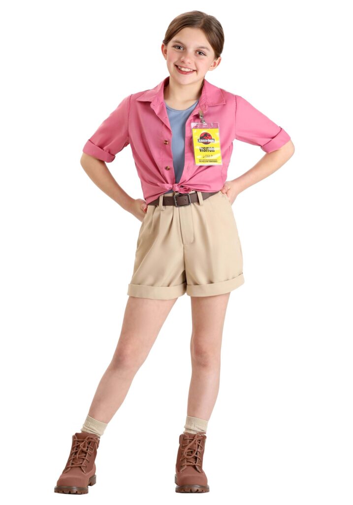 This costume nails that laid-back, jungle explorer look. It comes with a stretchy jersey tank top that layers underneath a pink challis camp shirt, which has buttons down the front. The camp shirt is light and comfortable, so your little Dr. Sattler can stay cool whether they’re battling dino-sized challenges or just doing some casual fossil hunting in the backyard. The cuffed twill shorts have a zipper fly and belt loops.Now, what’s a Jurassic Park visitor without a badge? This officially licensed costume comes with a cardboard visitor badge that slides into a clear plastic sleeve and clips right onto the shirt, just like a real guest at the park. It’s all the official swag of the park, minus the terrifying dino chases. And did we mention it’s officially licensed from Jurassic Park? Yeah, your kid’s not just playing pretend, they’re stepping into movie history.The Dino DodgerWhether they’re headed on a helicopter ride to the infamous Isla Nublar, or just hanging out with their dino toys in the backyard, this Dr. Ellie Sattler costume is perfect for any young adventurer. It’s practical, it’s stylish, and it’ll have them ready for any Jurassic-sized adventure that comes their way. Just make sure you teach your child how to dodge a T-Rex, should it show up at your doorstep!