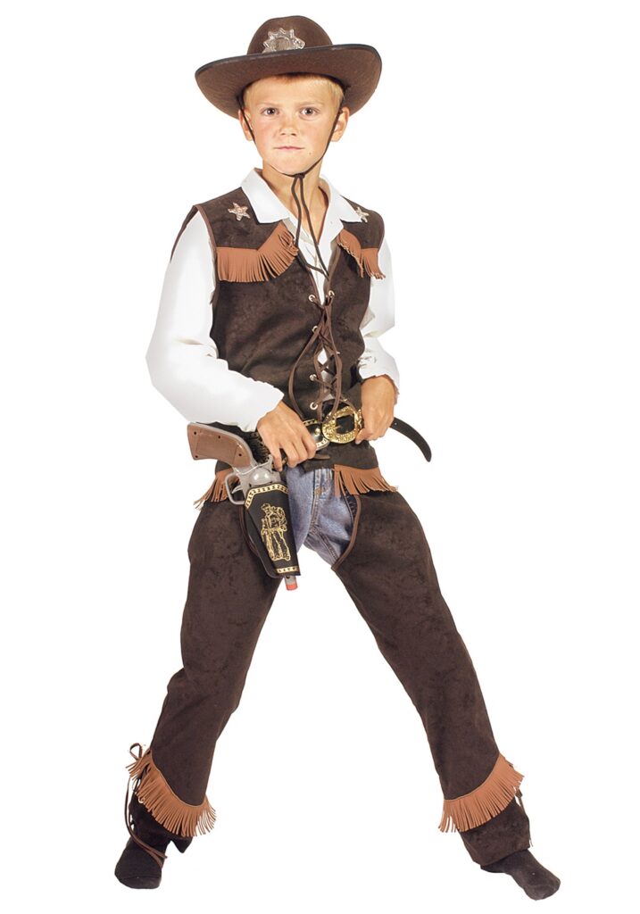 Even if you can’t be young again, you can certainly share those experiences with your child as he grows up. Maybe he’s been watching a few westerns on TV and got the idea in his head that it would be fun to dress up like a sheriff from the wild west… Well he’s in luck, because we’ve got this Kids Rawhide Cowboy Costume that’s just perfect for dressing up and playing cowboy, or for a sweet Halloween costume idea. This costume will definitely make him feel like he just walked out of an old western…This costume is 100% polyester. The vest has faux suede fringe and star-shaped studs below the shoulders. The vest laces up the front with a brown tie, and the chaps fasten at the front with Hook and Loop fastener. The chaps also have the fringes across the hips and ankles. Don’t forget to add a cowboy hat and a pair of boots to complete this rootin’ tootin’ outfit!