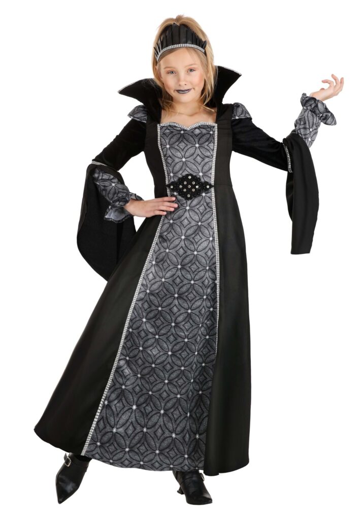 The dress itself features a blend of rayon crepe, printed satin, and velboa fabrics, each adding a layer of sophistication and texture. The central back zipper ensures the dress is easy to slip into, while the foam-backed collar and cap sleeves create a silhouette that’s both dramatic and comfortable. Highlighted by a dazzling crystal applique with black and silver facets and a rhinestone trim, this costume captures the light and the imagination in equal measure.No queenly costume would be complete without a crown, and this outfit boasts a stunning vinyl crown adorned with rhinestone trim. An elastic band helps secure it comfortably on the head, making sure it stays in place whether she’s twirling at a party or trick-or-treating. Designed for kids and pre-teens, this costume transforms any event into a magical affair.An Enchanting Evening of Treats.