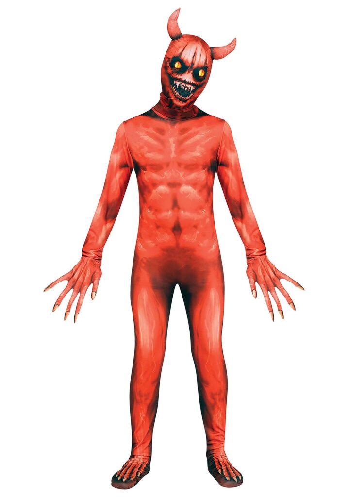 Step into the realm of the infernal with our Kid’s Terrifying Evil Devil Demon costume. This chilling ensemble transforms your child into a creature of pure darkness, inspired by ancient tales of demons that lurk in the shadows. The jumpsuit features a sublimated print that brings to life the fiery, muscular form of a demonic being, complete with eerie detailing that speaks of untold horrors. Matching gloves extend the sinister appearance with pointed fingers and demon nail prints, capturing the essence of a creature that thrives in the depths of the underworld.The hood, which covers the entire head, is designed to instill fear with its light-up demon eyes that glow ominously, piercing through the darkness. Stuffed demon horns protrude from the top, adding a menacing touch that completes the transformation. This costume is perfect for those who wish to explore the dark lore of demons and embrace the fearsome power that such a figure commands. Whether for a themed event or an eerie night of storytelling, this devil demon costume brings a mythical and nightmarish presence to life.