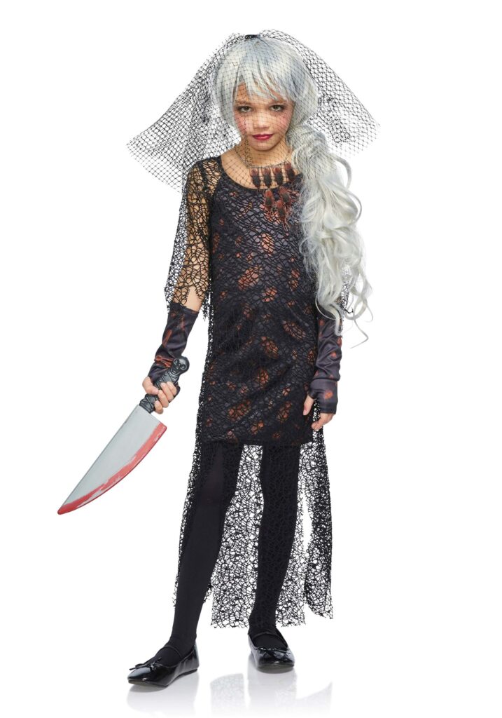 Have a scream-worthy Halloween in this Killer Cockroach Dress for Girls! The short, sleeveless dress is made of dark blue material that’s printed all over with images of brown cockroaches. Matching fingerless gloves are just what you need to get a good grip on your weapon of choice. The whole dress has an overlay of lacy black mesh material that covers the front and hangs in thick streamers from your knees to your ankles. A mesh veil is decorated with fake cockroaches. Don’t Mess with the Creepy Crawlies.