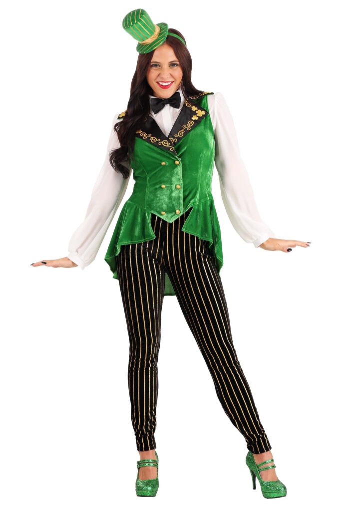 Product DetailsThis exclusive Lavish Leprechaun Women’s Costume contains all the luck you’ll need to have an amazing St. Patrick’s Day! The sleeveless green velour top is designed to look like a vest, with gold-tone shamrocks and vines embroidered on the black lapels, a double row of golden buttons running down the front, and an asymmetric hemline that’s longer in back. It looks festive and fun when worn over your favorite button-up shirt. The black leggings have a comfortable elastic waistband and have narrow metallic gold stripes printed along their length. The headband with its attached mini top hat is the perfect addition to your hairdo!Star of St. Paddy’sWhat do your St. Patrick’s Day festivities involve this year? Hopefully you’ll be up to plenty of mischief with friends, whether you’re drinking green beverages or trying out your best Irish accents while saying things like, “Top o’ the mornin’ to ya!” The only thing that would improve your fun is being dressed up as a stylish leprechaun. You’ll attract so much good fortune that you won’t know what to do with it all.
