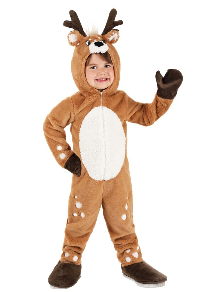 This toddler costume is made from 100% polyester, which basically means it’s as soft and cuddly as a stuffed animal, except this one giggles and might demand snacks. The cuddle plush jumpsuit zips down the center front, with a fabric strip over the zipper secured by a hook and loop fastener, because we all know toddlers are escape artists. The belly has a low-pile plush that’s perfect for snuggles, while embroidered spots on the legs and arms add that extra touch of “look at my baby, they’re a deer! “The hood is where things get serious, seriously adorable. It’s got a knit lining to keep your little one comfy, plush ears, embroidered eyes, and a faux fur tuft of hair on top. The sewn-in minky antlers are posable, which means you can adjust them to give your tiny deer the perfect look. The jumpsuit also comes with sewn-on hand covers that can be flipped back, just in case your little fawn needs to grab something (probably your snack).And let’s not forget the finishing touches: the sewn-in plush tail with faux fur and embroidered spots, plus foam and minky shoe covers with elastic bands on the bottom and rib-knit ankles to keep everything in place. This costume has everything covered, literally, from head to toe, making sure your little one is the star of the forest, or at least the living room.