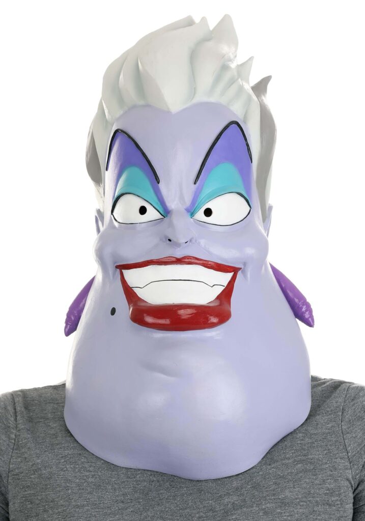 Strike fear into the hearts of mermaids everywhere with this exclusive, officially licensed Disney the Little Mermaid Ursula Latex Mask! The one-size-fits-most full-head mask looks just like the scheming Sea Witch, down to the purple and aqua eyeshadow, red lipstick, mole, and slightly fanged smile. Her famous white bouffant hairstyle and purple earrings make the look complete. Viewing ports in the eyes let you see where you’re swimming. The Perfect Plan?There’s only one thing to do: Bind Princess Ariel to an impossible contract, sabotage her every time she tries to fulfill it, get Triton to give up his freedom in exchange for hers and hope that the little mermaid’s boyfriend doesn’t stab you with a ship’s bowsprit. What could go wrong?