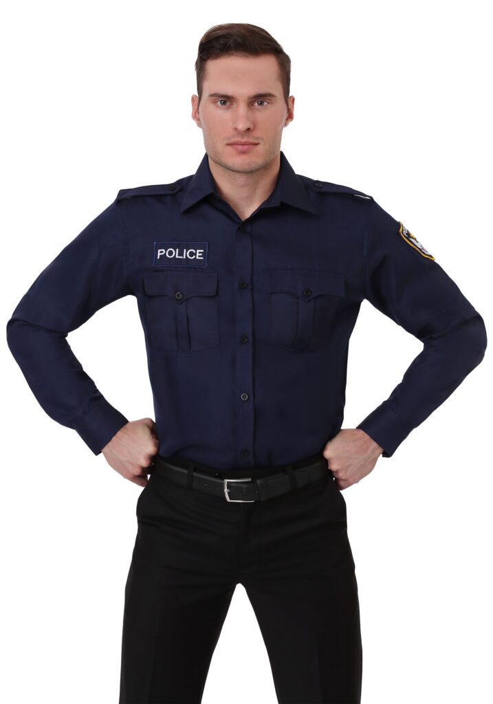 Introducing this simple Police Officer shirt! The costume shirt is a classic button-up style shirt in a navy blue color. It has a “police” patch on the front, along with a couple of chest pockets. The shoulder has a police patch embroidered onto the side for added detail. Just pair this shirt up with a pair of your best black pants and some sunglasses to give yourself a polished police officer look.Protect the Peace.