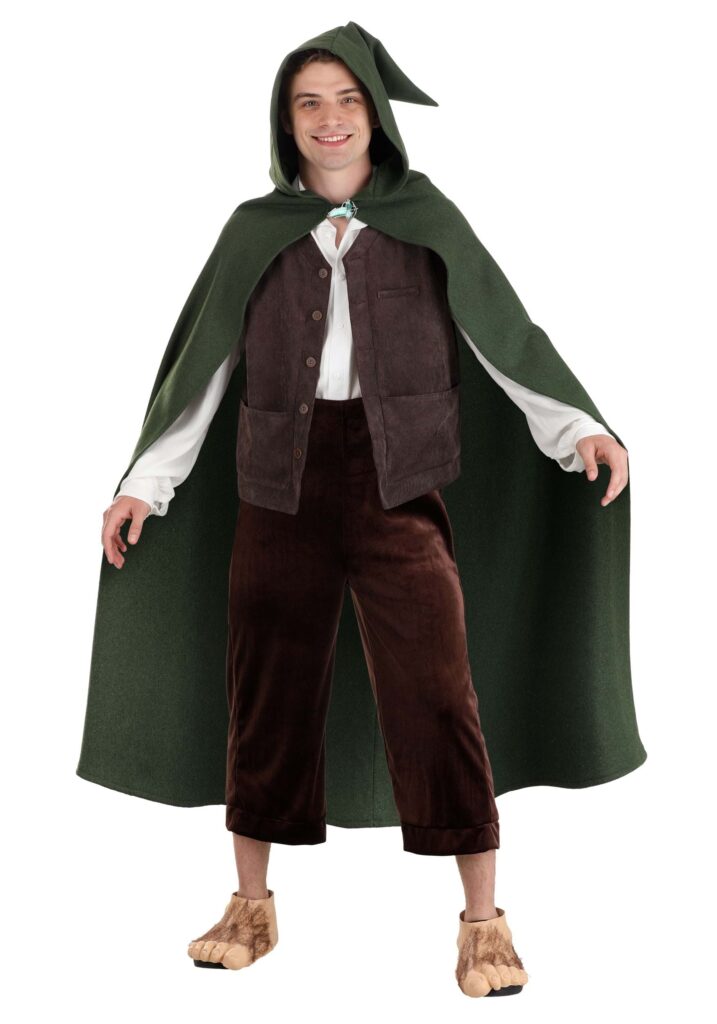 Bravely lead the Fellowship to Mount Doom and face down Sauron when you wear your officially licensed Lord of the Rings Frodo Costume for Men! The exclusive outfit looks like the one Frodo wears in the movies, and includes a travel-ready off-white shirt that goes under a brown vest. Fasten the suspenders to the soft brown velour pants to keep them in place while you fight off Orcs. The green cloak fastens with hook & loop fastener behind an Elvish leaf pin. Add the Hobbit feet as the final touch!  No Turning Back Get ready to save all of Middle-Earth! While dressed as Frodo, you may meet evil armies as well as kindly wizards and noble fighters, but you will be the hero that your home needs. The Shire will stay safe thanks to your determination. Oh, and make sure you bring along a sword that glows when bad guys are around. That could end up being really helpful to you.
