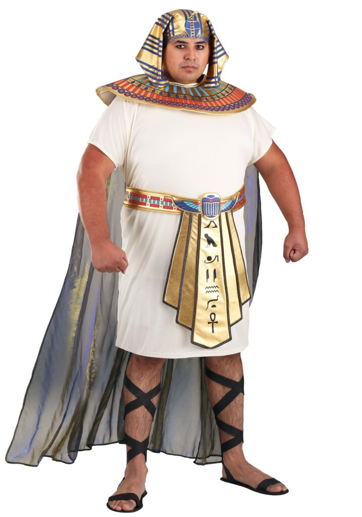 While we may not be able to exactly replicate King Tut’s exact curse (Dang it, man, we’re costume sellers, not sorcerers! ) we’re confident that with the help of our exclusive Plus Size King Tut Costume for Men, your natural charisma will be just as good at wooing the ladies! The outfit includes a comfortable ivory tunic with an attached sheer blue cape that goes underneath a flattering belt complete with a hieroglyphic-printed drape. A regal collar clasps around your lordly shoulders. As a crowning touch, a gold and blue headdress protects your head from the hot equatorial sun. Now, who’s up for a chariot race? Pharaoh’s Reward.