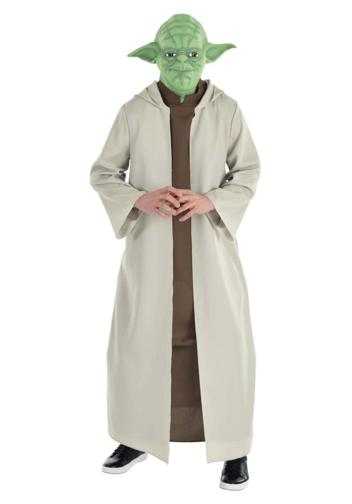 This officially licensed Star Wars costume comes with just two essential pieces: the robe and the mask. The robe is cream-colored with a dark brown faux shirt attached underneath, mimicking Yoda’s classic look from The Empire Strikes Back. It’s made of lightweight polyester, so while you may not feel the Force, you will feel pretty comfortable dispensing life lessons (or just snacks).The molded mask covers the front of the face and features dark green shading with basic details that echo Yoda’s wise and slightly wrinkled appearance. It secures in place, so you can maintain your mysterious aura even while dodging questions about when dinner will be ready. It’s simple, recognizable, and ready for any Jedi-level shenanigans.Size Matters Not. But Costumes? Kinda Do.This Yoda costume gets you from “regular guy” to “space legend” faster than you can say “Do or do not.” So if you’re ready to speak in riddles, shuffle like a swamp hermit, and wield zero actual lightsabers, this is the outfit for you. Wise choice, you have made.