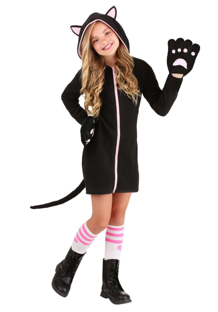 Product DetailsSo what will you say when your little ones ask for this Midnight Kitty Kids Costume is perfect for Halloween, a costume party, or an everyday stroll to the grocery store. This kid’s cat costume comes with everything they need to become an agile kitty this Halloween. This super soft black fleeze has an attached hood with cat ears and a long tail to sell their new identity. The attached mitts have sewn on pink material to further look like cat paws. Add black shoes and cat makeup to complete the look. She’ll be one cool kitten! Best of all, the exclusive costume is made by our own in-house designers, so you can worry less about the stitching and worry more about where to find the best candy this time of year!mouths agapeYour kiddo will love dressing up as a kitty cat for Halloween, right? After all, when you combine one cute thing with an already adorable one, you have a recipe for ultimate cuteness. The entire neighborhood will be standing there in awe of you all this costume season.