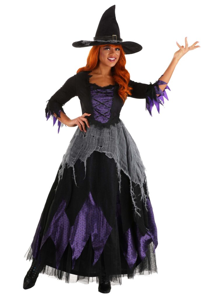 Product DetailsCreate an effect as powerful as a potion’s charm when you wear an exclusive Midnight Purple Witch Costume for Women! The ankle-length gown zips up the back and features a black bodice with a gorgeous purple satin inset. Its three-qiuarter-length sleeves have tattered ends that match the jagged edges on the skirt’s black, purple, and gray tiers. A built-in petticoat gives the skirt volume. The foam-backed hat features a poseable brim, a faux leather band, a decorative silver buckle, and a band of draped gray cheesecloth. The Spell Is Cast Slip into this costume and prepare for a truly magical night of fun with friends! Your outfit wil cerainly look charmed, but unlike the spell concocted for Cinderella, it won’t dissolve into ordinariness at the stroke of midnight. Stay out as late as you want, meet up with your animal familiars, fly past the moon on a broomstick, all that good stuff. And above all, be sure to let everyone get a chance to admire your fantastic look.
