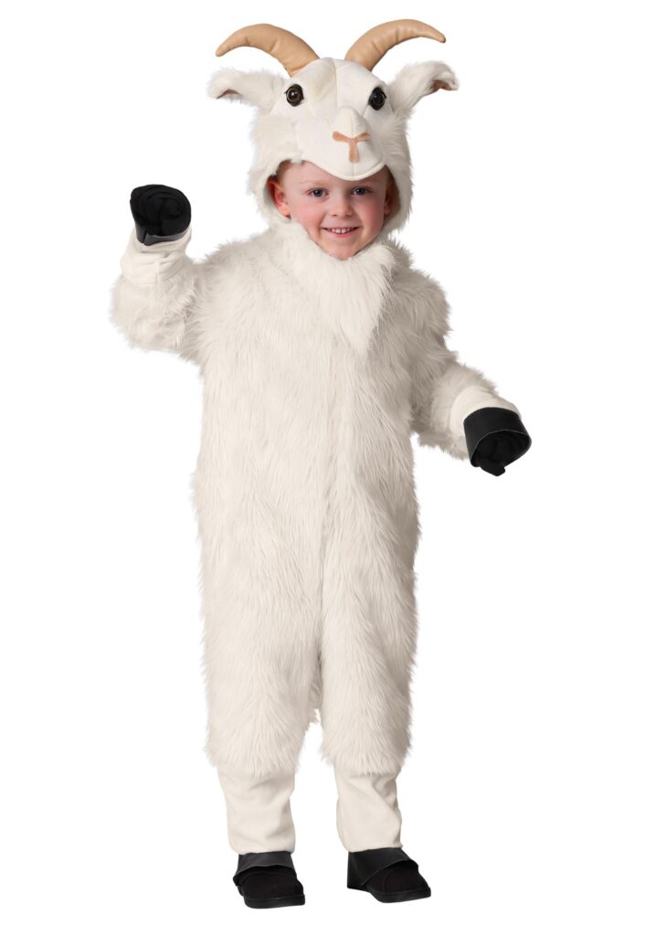 Design & DetailsIf your kids keep looking at mountains like they’re destined to get there, help them feel out their inner climber with this exclusive Mountain Goat Costume for boys and girls. Our team of designers has worked hard to create this high-quality faux fur jumpsuit with a tuft of a goat tail and vinyl hand and foot covers to create the look of hooves. The hood has a long fur beard, brown plastic eyes, and has a shaped goat snout. The horns are stuffed vinyl. They’ll just need to perfect their best billy goat sounds!A LITTLE BILLYWhether they are climbing on top of everything in view, precariously purchased on ledges like they’re kings and queens of the dining room, or even occasionally just snuggling up calmly to a favorite show, your little kid would make a great little kid with this Mountain Goat Costume! Fortunately, the horns are soft so you don’t have to fear any headbutts!