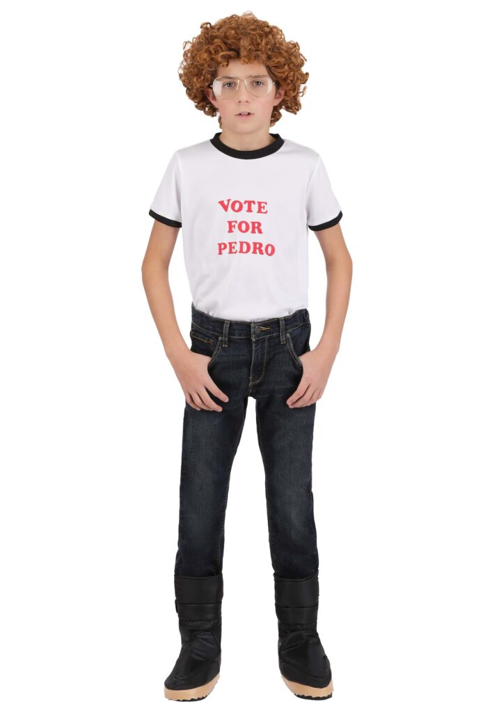 Your kiddo will look straight outta Preston, Idaho in the iconic white “VOTE FOR PEDRO” tee, complete with retro black neck and sleeve bands, just like he wore during his historic dance. The shirt is soft jersey knit, so it’s comfy enough to wear while practicing sweet moves in the living room.Top off the look with the curly golden-brown wig that basically screams “liger enthusiast.” The mesh wig cap keeps things secure during all types of spontaneous boogying. Silver-toned wire glasses and foam-backed boot covers finish the transformation, giving your kid everything they need to become a middle school mystery wrapped in a thrift-store enigma.Heck Yes It’s Awesome.