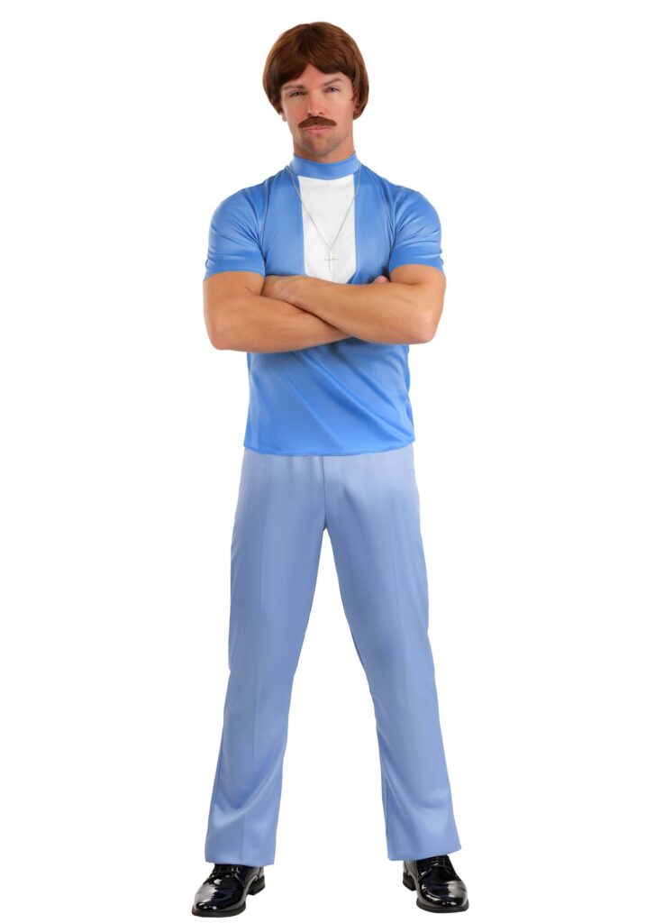 You’ll look like you just rolled out of your camper van and into a motivational speaking gig in the powder blue jersey-style shirt. It’s got a crisp white front panel and a ribbed collar that screams “suburban swagger, 1982 edition.” The poplin pants match perfectly, just a slightly lighter blue, complete with elastic waistband and pressed lines to say, “I may be broke, but I iron.”Accessories? Of course. The metallic silver necklace delivers peak Rico confidence. And the hair, oh, the hair. The synthetic styled wig has a built-in elastic cap for a secure fit, and the self-adhesive mustache will have people questioning if you actually live in a van or just spend weekends throwing footballs at camera tripods.Rico Suave, Baby.