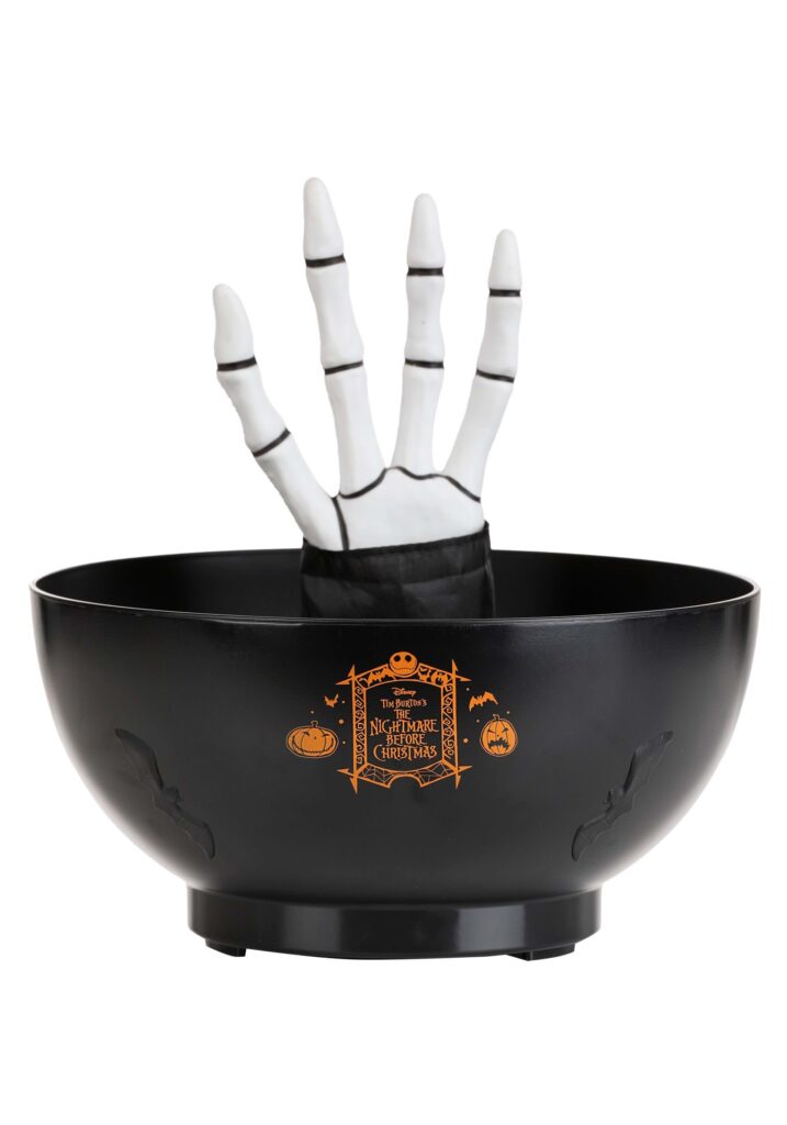 Product DetailsThe bowl features a black finish with an orange NBC emblem on the front, complete with festive jack-o’-lanterns and signature gothic flair. But the real magic? That bony hand rising from the candy like it’s reaching from beyond the grave (or just really into Tootsie Rolls). The hand is sculpted to match Jack Skellington’s long, spindly fingers, and it moves to startle unsuspecting snackers when they reach in.The bowl’s a great size for holding plenty of candy, making it an ideal addition to your Halloween party table, front porch setup, or even your year-round Tim Burton-themed snack nook (hey, no judgment).Fright Bites OnlyWant a candy dish that’s more “Haunted Holiday” than “boring bowl from the back of the cupboard”? Jack’s got you covered. This animated Nightmare Before Christmas Candy Bowl adds a perfect little jolt of creepy charm to your Halloween setup, and maybe a jump scare or two for the neighbor kids. Happy haunting, and remember: it’s all fun and games until the hand grabs back.