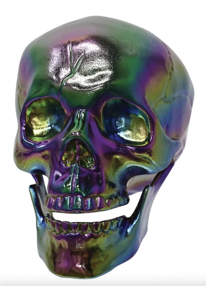 Product DetailsHave the most unique seasonal decor around with this Oil Slick Skull Halloween Decoration! The realistic molded skull has a hinged jaw and is colored with a greasy-looking palette of deep purples, metallic yellows, silvery blues, and battery-acid greens to look as though the unfortunate skull was bathed in a pool of oil.