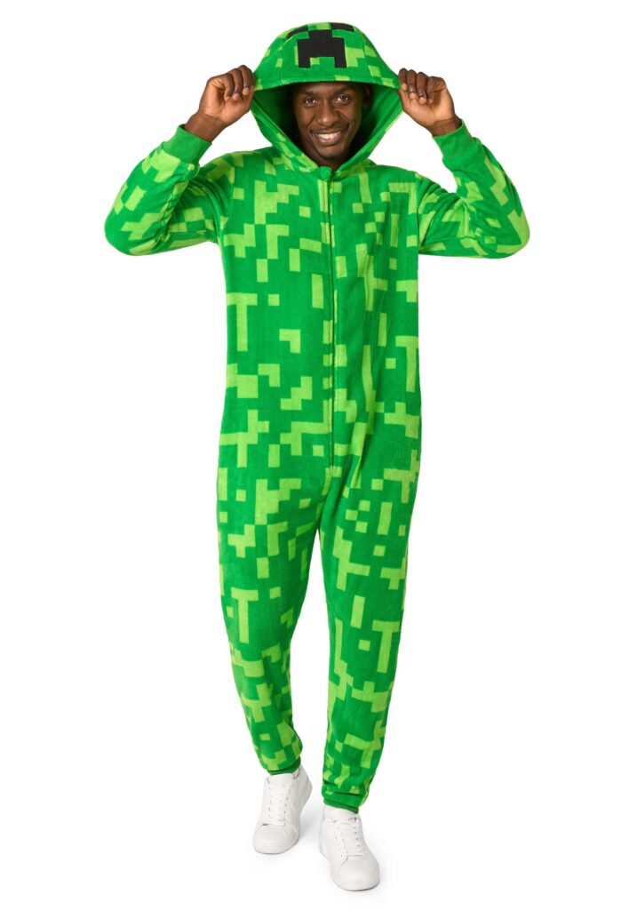 This officially licensed onesie is printed with the classic Creeper design, a pixel-perfect mix of dark and light green squares that fans will instantly recognize (and maybe avoid out of instinct). The front zipper makes getting in and out easy, so you won’t need any redstone engineering to suit up.The hood features a printed Creeper face, turning your noggin into the most feared mob in the Overworld. Rib-knit cuffs and ankles keep the fit snug and comfy, whether you’re lounging on the couch or silently lurking in doorways for dramatic effect. Just add your favorite slippers and you’re ready to chill, or chill and hiss.Loungewear That Goes Boom.