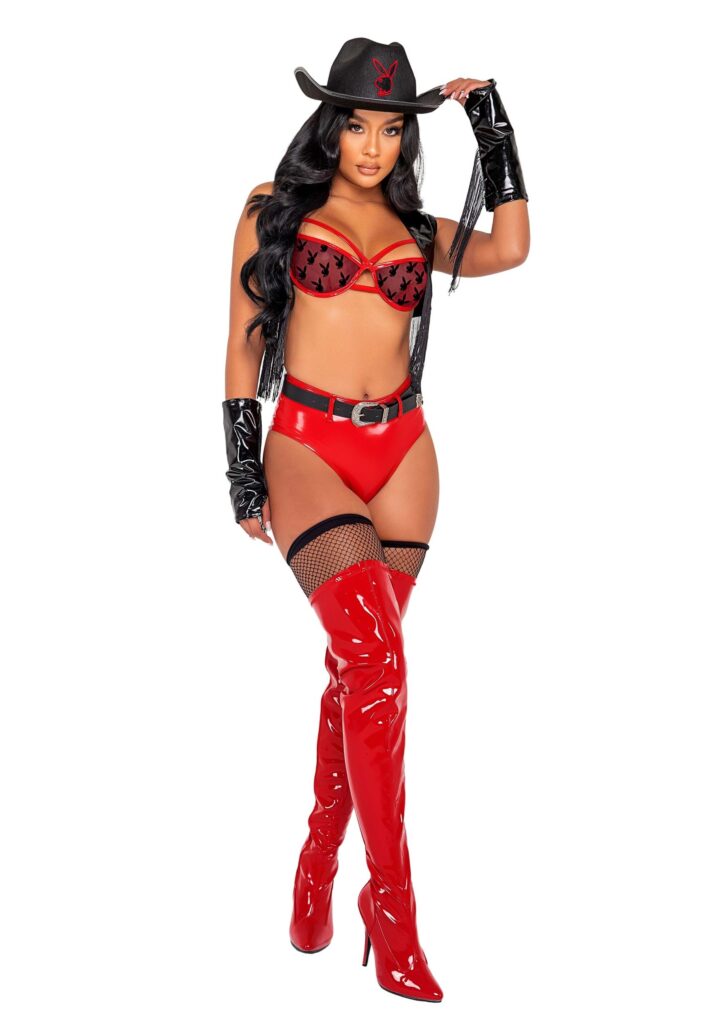 Product DetailsThe costume includes a fringed faux patent leather vest and matching gloves, a bra with red faux patent trim and Bunny flocking on the cups, high-waisted faux patent shorts and contrasting belt, and a hat with the Bunny patch. Add your own leg and footwear and you’ll be set for a night of dancing and delight.These Boots Are Made For Walkin’Although you’ll have to provide your own boots and stockings with this one. Which is perfect, really, because not everyone has the same taste in boots, but everyone has a pair of great boots that scream their style. Go classic with cowboy boots, use the model for inspiration and go with thigh highs, or keep it classy with shorties or even high heels. Strap on the bra, cover up with the vest, and slide on the shorts to feel like a real Bunny in the making.