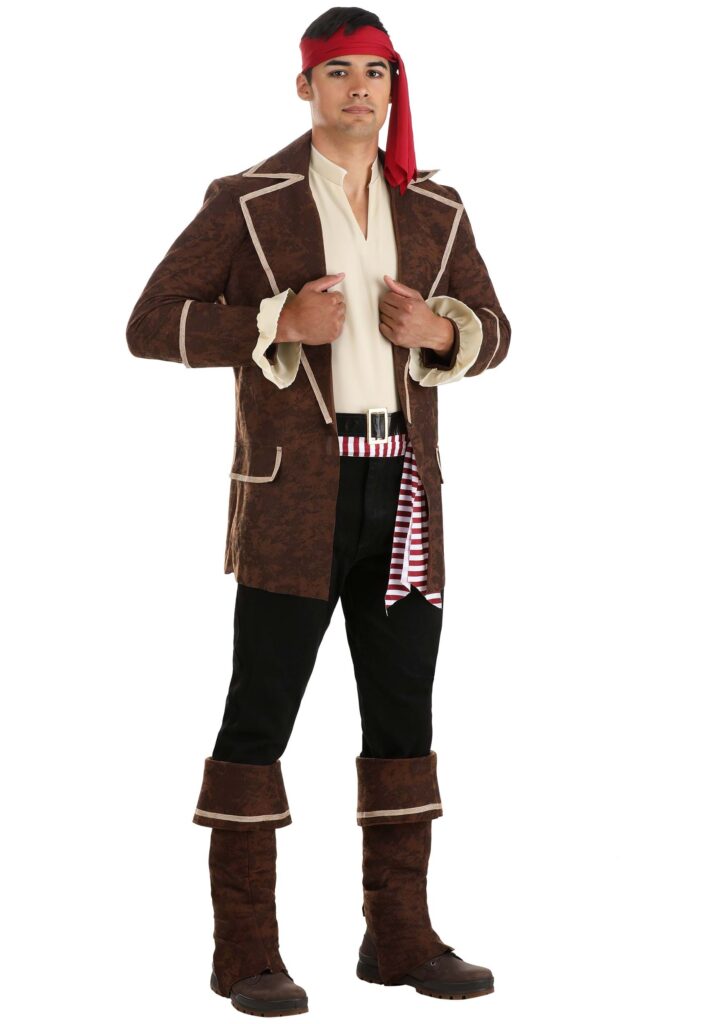 Design & DetailsSet sail for fortune and fame in this exclusively designed Plunderous Pirate Adult Costume! A V-neck shirt front of the finest material was pillaged from the hold of a merchant ship and now graces your everyday wear. It goes underneath a brown jacket trimmed with ruffled cuffs. A red and white sash ties rakishly around your waist, and a red bandanna knots around your head to protect it from the sun’s rays. A pair of brown seaboot covers finishes your dashing ensemble!It’s the Pirate’s Life for You!This Halloween, it’s up to you how you want to live your pirate destiny. Will you terrorize the neighbors with gruesome sea shanties, steal all of the candy from the party bowl, and declare no quarter on the dog next door who won’t stop barking? Or will you be the suave, lady-killer type whose swordfighting skills are only equaled by his hilarious wit (and who still has all of his teeth)?