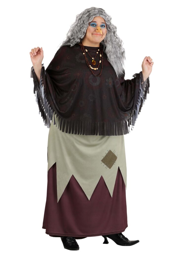 The costume includes a long burgundy and olive dress with a jagged hemline and an empire waist that’s cinched with an elastic band for a comfortable fit. It’s made from medium-weight jersey knit fabric, soft enough for long nights of spellcasting or mildly threatening tarot readings.Layered over the dress is a black poncho with all-over print and long fringe at the edges. It slips right on and brings some real “wandering forest witch” flair to the outfit. The costume also comes with a plastic beaded necklace that looks like it was collected during a full moon, and maybe cursed a little.To top it all off, you’ll get a gray wig with long, wiry synthetic fibers, plus a latex nose with an elastic band that transforms any mortal face into Grandmama’s famously lumpy look. Just add a few cackles and some herbs in unmarked jars.A Little Magic, a Lot of Mayhem.