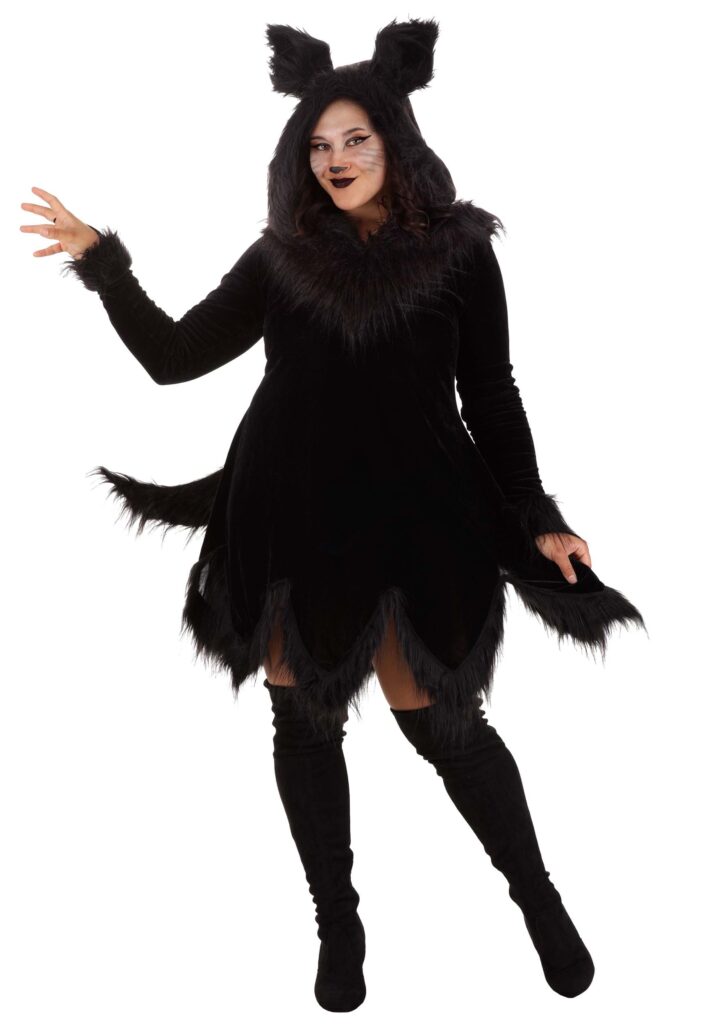 Product DetailsThis dress promises comfort and style and is made from a blend of 100% polyester velour and jersey knit. With its rich texture, the long pile of faux fur enhances the dress’s wild appeal, edging the hood, collar, cuffs, and hemline. The velour dress slides easily with a back zipper, ensuring a snug fit.No wolf look is complete without its signature tail, and this costume doesn’t disappoint with a faux fur tail sewn to the dress. The hood, crowned with faux fur ears, adds the finishing touch, ensuring you’re the belle of any Halloween ball. Proudly designed and exclusively made by us, this costume transforms your Halloween into a werewolf-themed spectacle.Call of the WildReady to take on the night? Whether under a full moon or the twinkling stars, step out in style with this exclusive Women’s Plus Size Black Wolf Costume Dress, exclusively made by us!