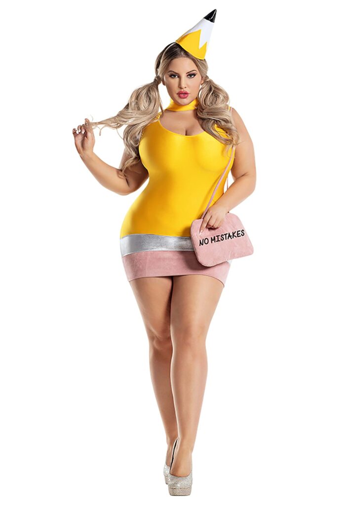 Take pencil appreciation to the next level with this Women’s Plus Size Pretty Pencil Costume! Inspired by the deep love certain office supplies receive, this clever costume is a must-have for any confident pencil user! The outfit starts with a sleeveless mini-dress made from a combination of polyester, spandex stretch knit, and faux suede fabrics. A zipper at the back makes dressing in the figure-hugging garment easier.While silver knit fabric and dusty pink suede shape the eraser end of a pencil for the dress, an included hat gives the look its sharp graphite tip! Made from similar materials, the petite pointed hat wears securely when connected to a headband by its attached elastic loops. Polish the look with the accompanying crossbody bag with the words “NO MISTAKES” printed on the front.