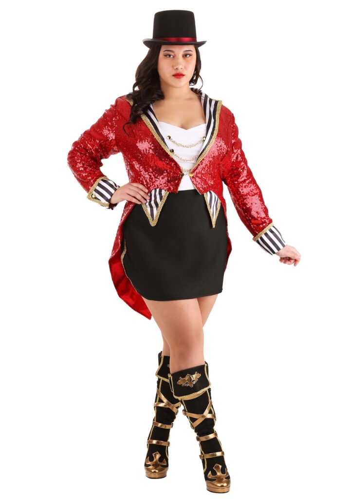 Design & DetailsThis Ringmaster costume is Made by Us. This means that our in-house creative team designed this three-piece costume, giving it all sorts of thoughtful details that you’ll never find in a big box store. Featuring a sequined tailcoat, a sheath dress, and a top hat, this costume is ready for the spotlight as soon as it arrives at your door!The sequined jacket secures in the front with elastic loops that slip over the gold buttons. Trimmed with gold brocade and black and white stripes, the jacket is also fully lined with a dramatic satin. Layered underneath the jacket, the dress is detailed with chains on the bodice and gold braiding down the sides of the skirt. Complete with a top hat, this plus-size Ringmaster costume is a show-stopping choice for your next costumed event!Risky BusinessJust think about it for a moment. You’d have to be a pretty wild person to learn how to tame a lion. There’s a lot of risk in standing next to a fire-breathing muscle man and trusting Bongo the clown not to barrel-roll you into the audience! If you think you have what it takes to not only control the circus but also let loose like a ringmaster, then this sexy sequin ringmaster costume might be for you!