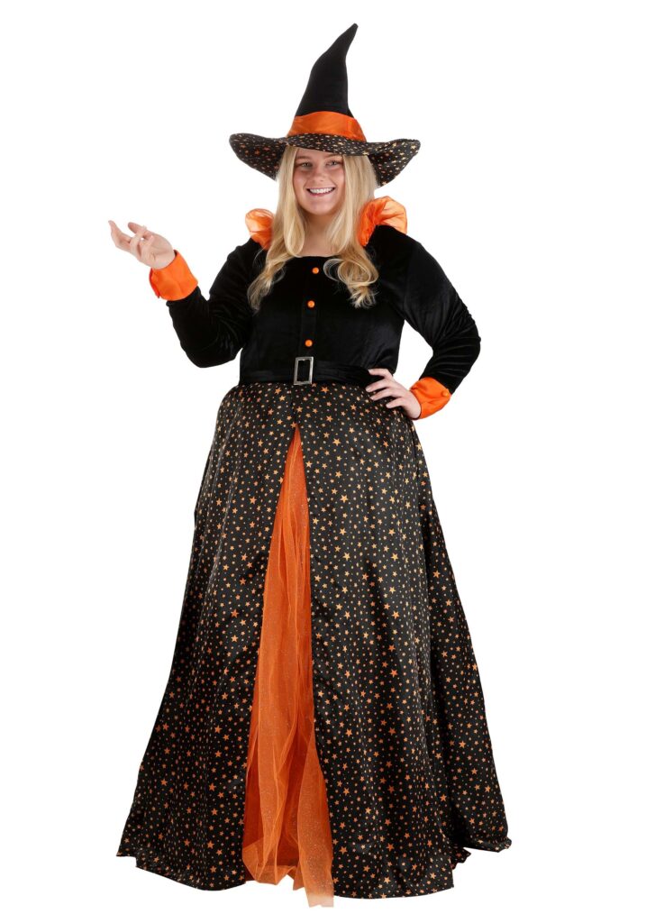 You’ll be the undisputed winner of Halloween outfits when you wear your exclusive Plus Size Sparkling Orange Witch Costume for Women! The lovely floor-length gown features a princess-cut bodice made of black velour with matching long sleeves. A column of orange buttons decorates the front above the velour belt. The sweeping skirt is made of star-printed black satin and is slit up the front to reveal a built-in orange tulle petticoat. The pointed black velour witch hat is backed with foam and circled with a wide orange ribbon band. Marvelously Magical Witches are tricky beings. They can be terrifying and dangerous, but also enchanting and mesmerizing. If you want to embrace both the traditionally spooky and the magical allure of the Halloween season, this gorgeous costume is for you! If the people of long-ago Salem saw you wearing this gown, they wouldn’t bring on the torches and pitchforks – they’d probably ask you to teach them your fashion secrets.