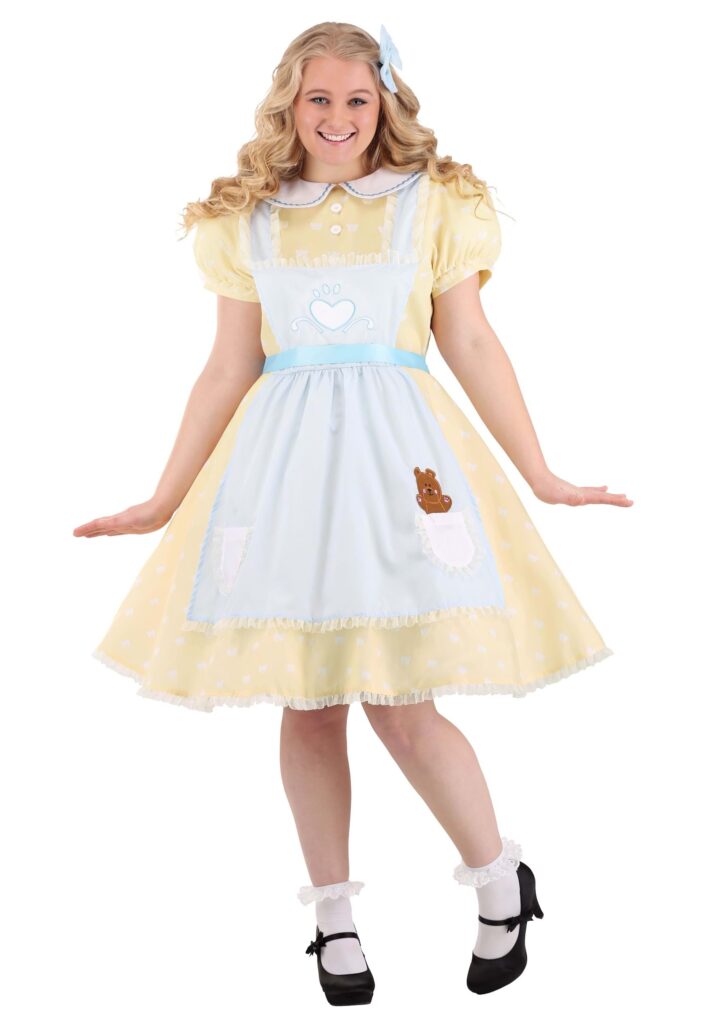 Dress up as everyone’s favorite burglar this year in our exclusive Plus Size Goldilocks Women’s Costume! This pint-sized porridge pilferer wears the most adorable yellow dress with a ruffled edge, blue-trimmed Peter Pan collar and puffed sleeves. A sweet little apron features an embroidered heart and two ribbon-trimmed pockets with a happy brown bear peeking out of one. Tie the apron’s blue sash around your waist, pin the matching blue bow in your corkscrew curls, and you’re ready to cause some mischief! Fairy Tale Fun.