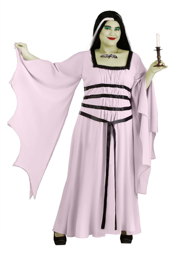 Design & DetailsBecome the classic character from The Munsters with this Plus Size Lily Munster Costume. Inspired by her attire from the series, this costume starts out with a simple lilac dress with a square neckline. It also has black satin accents in front. The dress fits with a zipper down the back, making it easy to change into and the included necklace finishes the look to make you feel like the Munsters mom!