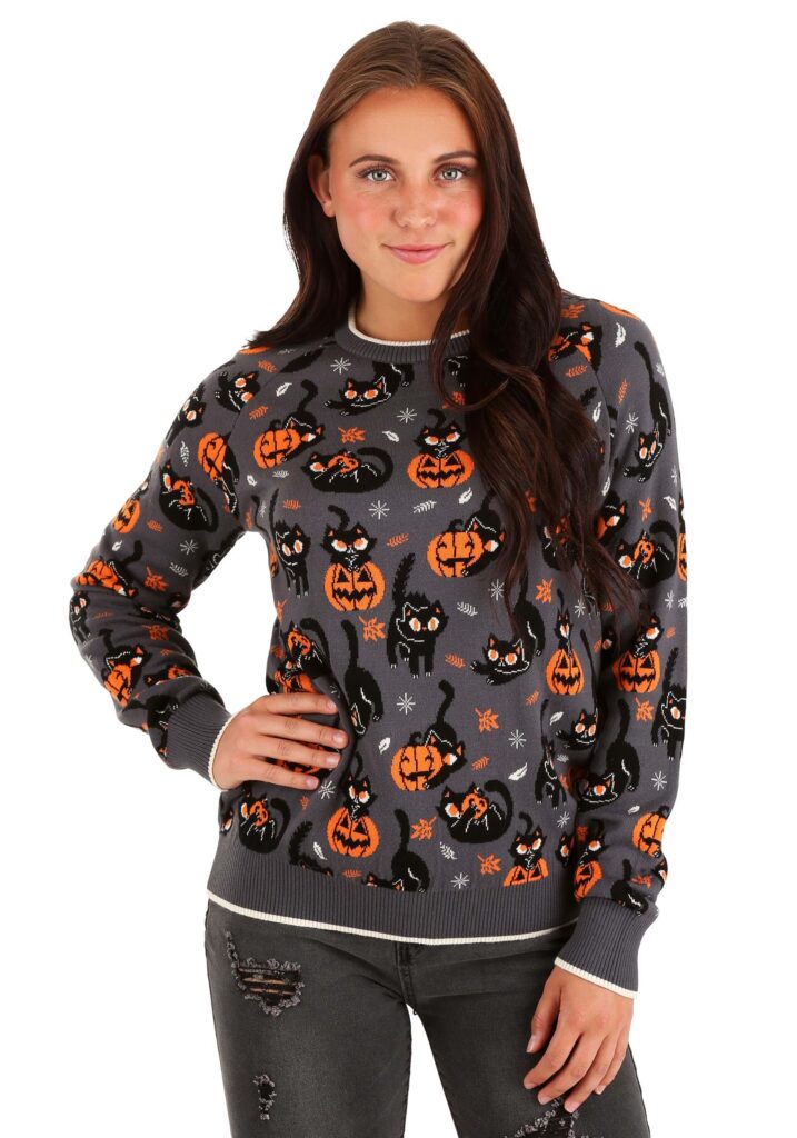 Inspired by the mischievous witch’s feline familiar, this Quirky Kitty Halloween Sweater is part of our cozy ugly Halloween sweater line. The knit sweater is constructed from a cotton and acrylic blend that’s comfortable enough to fend off those brisk autumn chills. The raglan-style sleeves and the rib-knit waistband help give it a modern fit, making it an easy addition to your everyday fall wardrobe. Of course, the best part about this unsuspecting sweater is that it has knit-in graphics of an adorable black cat all over it… and that little cutie is full of precarious intention (just how we like our kitty cats). You can wear it in lieu of a full costume for Halloween, or wear it as you make some mischievous schemes of your own.