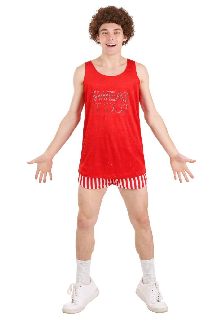Design & DetailsLet’s get ready to sweat it out! Are you ready to get everyone else in shape? Not only will this costume give everyone some healthy nostalgia, but it will also inspire them to sweat it out! Your buns will thank you later. This offically licensed costume comes with everything you need to get fit! The red velour tank top has a sequin lettered “Sweat It Out” on the front and the red and white striped stretch terry cloth shorts have an elastic waistband for a comfortable fit. The costume is completed with the brown, curly wig that is on a mesh cap for comfort. This time you can sweat it out without any shame or fear because with the right dance moves, the right music, and this costume you’ll have the entire party excited to join right in with you!Sweating and Stylin’Maybe you were a follower as soon as you saw this guy work it. Perhaps you were like most of us and absolutely loved it. Well, you loved it until you realized that your mom recorded it and played it on a loop at your high school graduation party. Maybe, because of all that confidence Richard Simmons gave you, you were able to laugh it off. And now you’re here, sweatin’ it all out again. Now that’s what we call the workout video star magic!