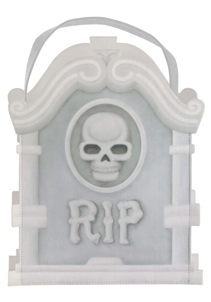 This exclusive RIP Tombstone Trick or Treat Bag is the perfect accessory for a scary Halloween costume! The bag is shaped like a fancy antique headstone and the front is decorated with a skull and the abbreviation “RIP.” A black handle is attached to the top. It’s a great way to add a creepy touch to any classic Halloween costume!
