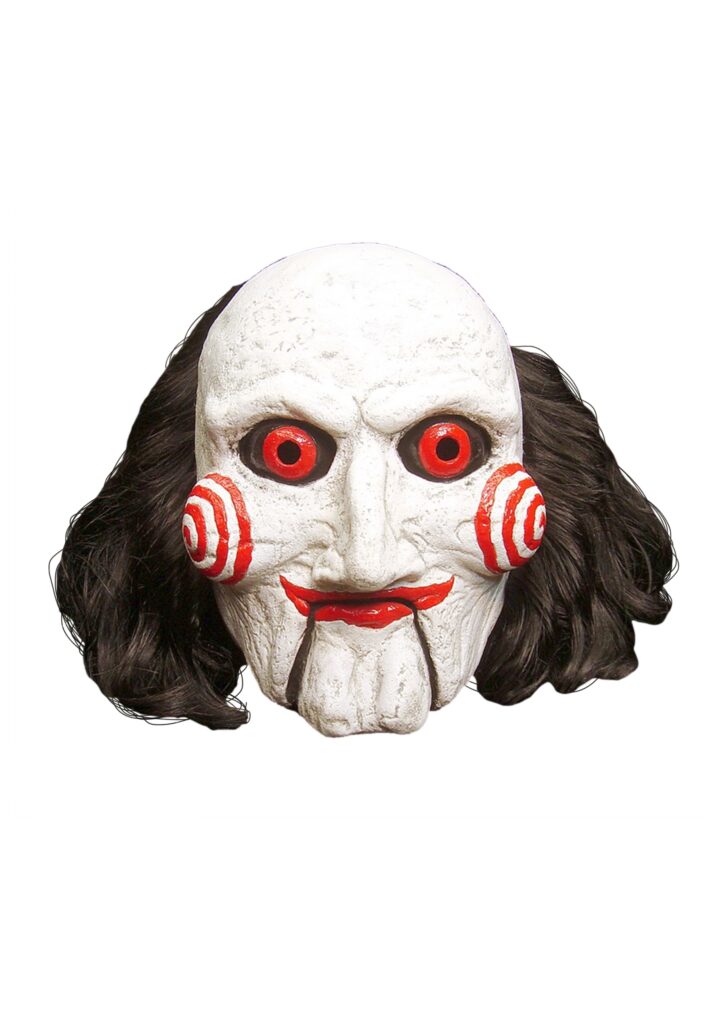 When Billy, the mechanical ventriloquist puppet used by John Kramer (aka, Jigsaw), comes riding in on his old-fashioned red tricycle, you know something bad is about to happen! If there’s anything creepier or more sinister than using a puppet to inform the victims of your deadly games about the rules and instructions they have to follow in order to survive, we don’t know what it would be (and frankly, we would prefer not to find out! ).So if you’re the mood to play a game this Halloween, become The Jigsaw Killer’s personal little puppet of death by wearing this Saw Movie Billy Mask! This officially licensed mask covers your face and gives you that sinister evil clown puppet look that will scare the heebie-jeebies out of anything this Halloween! Pair it with Billy’s trademark red bowtie and black and white suit for the full gruesome horror movie effect!